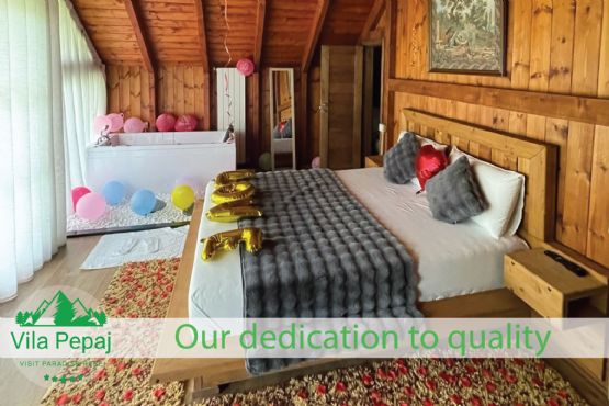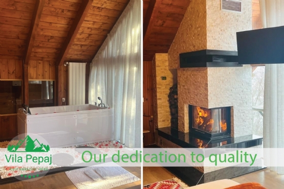 • Vila është e ndërtuar dhe e areduar tërësisht nga druri, që mysafirët tanë të ndihen sa më afër natyrës dhe të shijojnë një kënaqësi dhe rehati që mund të gjejnë vetëm brenda një vile nga druri e ngritur brenda një pylli.